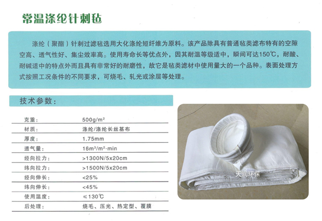 天潤環(huán)保生產(chǎn)的滌綸針刺氈除塵器濾袋是公司主推除塵配件之一 ,它是_用于布袋除塵器的配件,采用的材料也是_好的,下面為您簡單的介紹一下該布袋的具體使用材料吧。